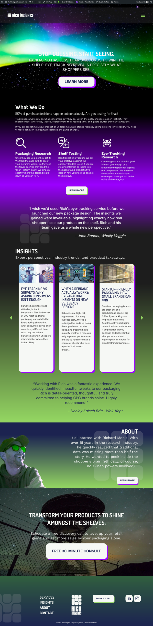 Rich Insights had practical capabilities in eye-tracking, shelf testing, and analyzing real shopper behavior. However, the brand read like a research vendor, not a premium partner that helps CPG teams make expensive packaging decisions with confidence.