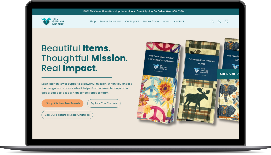 The Giving Moose website was built on Shopify with a focus on intuitive navigation, clear UX, and performance.