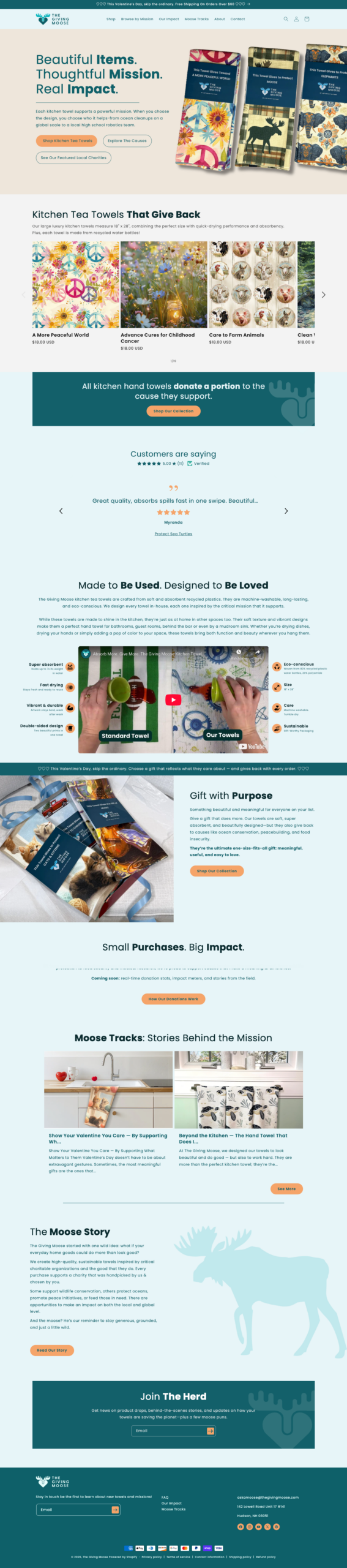 We positioned The Giving Moose as more than just another kitchen towel company. It’s a platform for everyday generosity, where small actions add up to real impact. That idea became the backbone of the verbal brand and content strategy, guiding everything from page hierarchy to product storytelling.